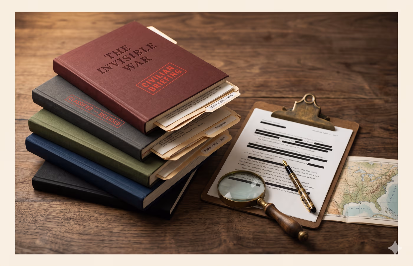 The Invisible War dossier and its four companion field manuals, photographed for publication.